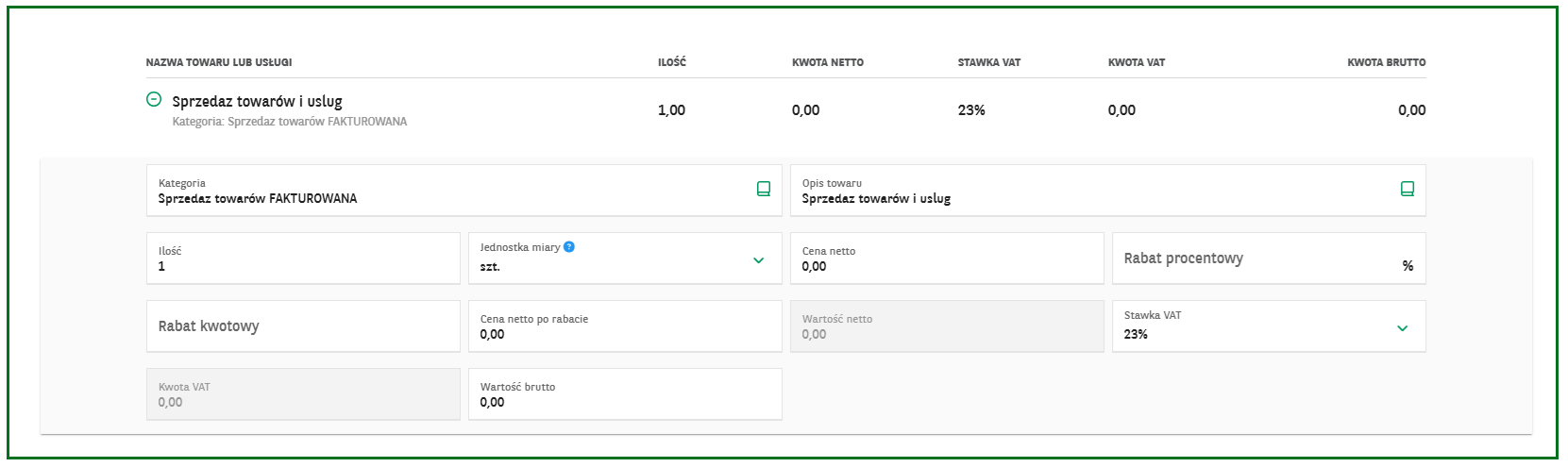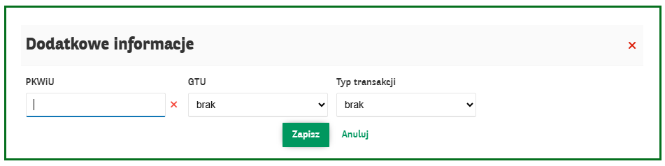 - uzupełnić kod PKWiU, GTU oraz typ transakcji (jeśli nie dotyczą - wybierz opcję brak, pole PKWiU pozostaw puste),