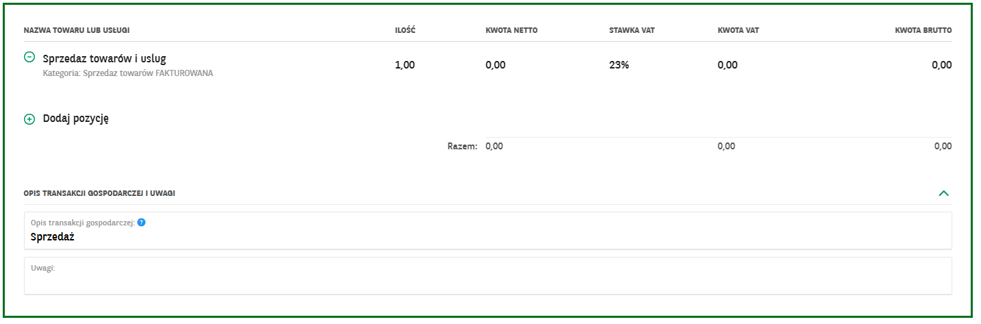 - uzupełnić pozycje dokumentu (opis, cena, ilość, stawka VAT),