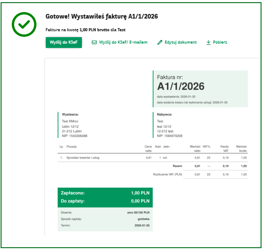 Po wystawieniu faktury otrzymasz komunikat sukcesu z informacją, że wystawiłeś fakturę.